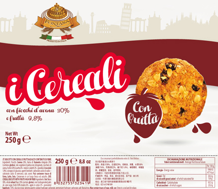 MADE IN ITALY CEREAL AND FRUITS BISCUITS Italian traditional breakfast and snack coming in Round-shaped biscuits of a light brown colour, with pieces of sultanas raisins on the surface, packaged in a cylindrical-shaped pack. The Cereals and fruits baked cookie has full international health and safety food certifications, designed and prepared to the worldwide business to business food and beverage distributors |